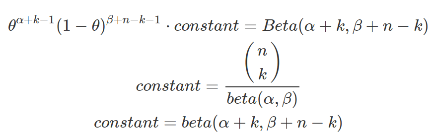 ). When Binomial distribution is used as the likelihood function and Beta as prior, the resulted posterior distribution is a Beta distribution. And the constant part normalize the posterior distribution, therefore it forms a new beta function.
