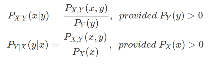 Conditional distribution of x dependent on y is calculated by the probability density of each pair of x and y, divided by the density of y (the value correspond to y in the pair) in the marginal distribution of Y, and vice versa. Therefore, the resulting distribution maintain the exact dimensionality of the original PMF. For the following tables, the first one is conditional distribution on y and second one is on x.
