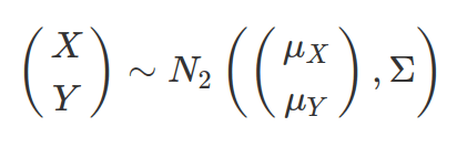 For two continuous variables X and Y, each of which comes from a normal distribution. Their bivariate distribution is defined in terms of their means, standard deviations and correlation between them. The joint distribution of X and Y is defined as: