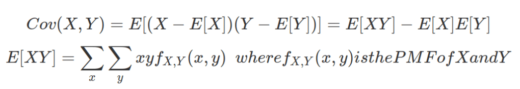 Cov(X,Y) = E[(X – E[X])(Y – E[Y])], where E[.] is expectation of Value, also known as mean. Cov(X,Y) = E[XY – YE[X] – XE[Y] + E[X]E[Y]] = E[XY] – E[Y]E[X] – E[X]E[Y] + E[X]E[Y] = E[XY]-E[X]E[Y]