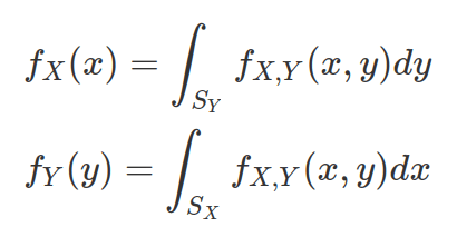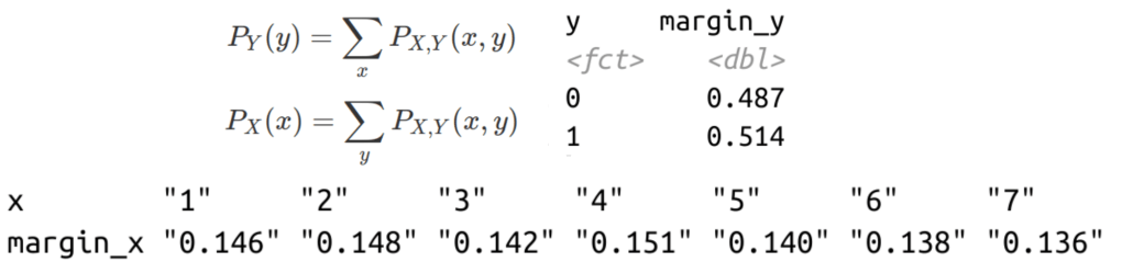 Essentially, the marginal distribution of y is derived by summing up all densities corresponding to all x values for each individual value of y (sum up each row, and derive the value on the “margin” for each row). Correspondingly, the marginal distribution of x is calculated by summing up all densities of y values for each x (sum up each column, and write the value on the “margin” below each column).