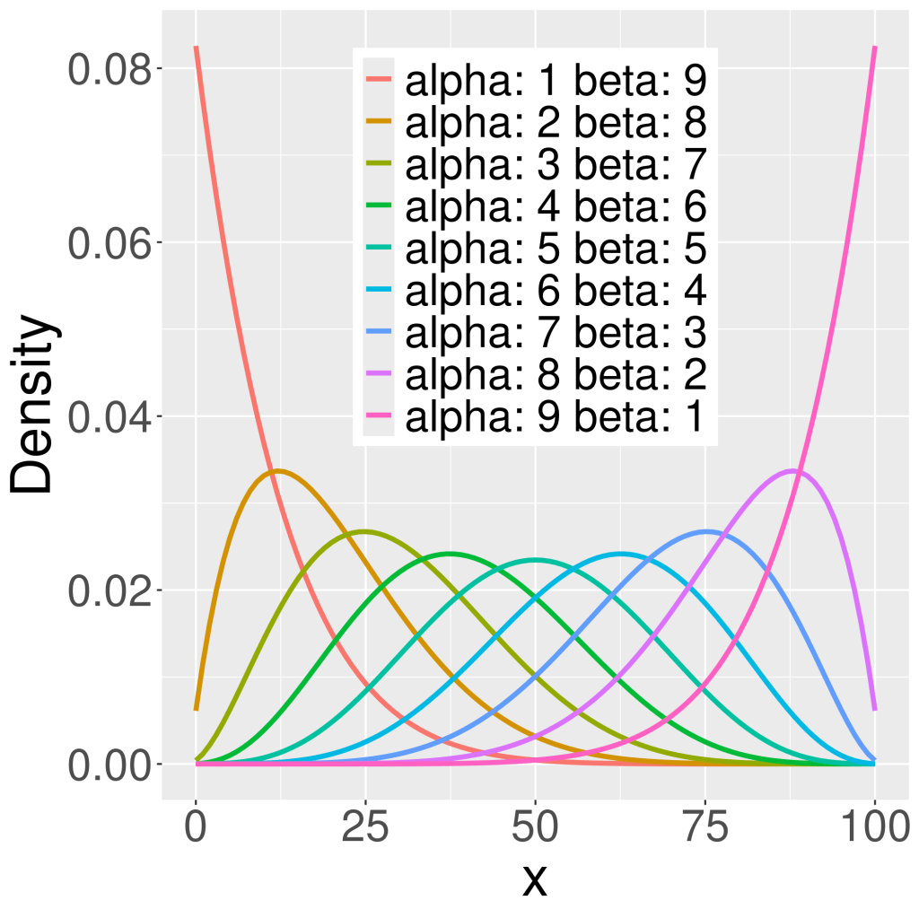 In R, we use dbbinom(x, size, alpha, beta) from the “extraDistr” package to model Beta-binomial’s PMF and pbbinom(q, size, alpha, beta) and rbbinom(n, size, alpha, beta) for CDF and random sampling.