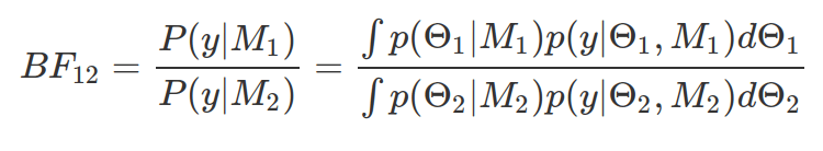 Bayes Factor (BF) is a measure of relative evidence quantified by the ratio of marginal likelihoods. It is a tool, in Bayesian statistics, to test hypothesis, comparing any kind of hypothesis/models, via quantifying evidence provided by data in support of one model or another. A bigger BF indicates M1 more favoured by evidence than M2. For above example, BF12 is 2.2, BF13 is 5075 and BF23 is 2286. There is also a scale proposed by Jeffreys (1939) for Bayes Factor strength, in which 3-10 provides moderate evidence, 10-30 provides strong evidence, and >30 shows very strong evidence for model whose marginal likelihood is on the numerator part of the BF. This model comparison method is very different from the likelihood-ratio of frequentist method. Because here, the ratio is independent from model parameter, as all prior parameter values are taken into account simultaneously.