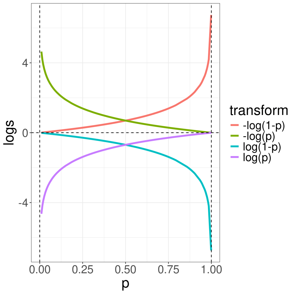 Given p is between, not include, 0 and 1, the following transformation indicates what logistic regression tries to achieve for data belongs to each class. When data truly belongs to y=1 class, logistic regression tries to minimize -log(p) (the green curve); when data’s true label is 0, logistic regression tries to minimize -log(1-p) (the red curve). Note the output from log-loss function ranges from 0 (inclusive) to infinity. The ideal output from logistic regression is to have p approaches 0 for y=0 class, and p is close to 1 for y=1 class, in order to have close-to-zero loss function output.